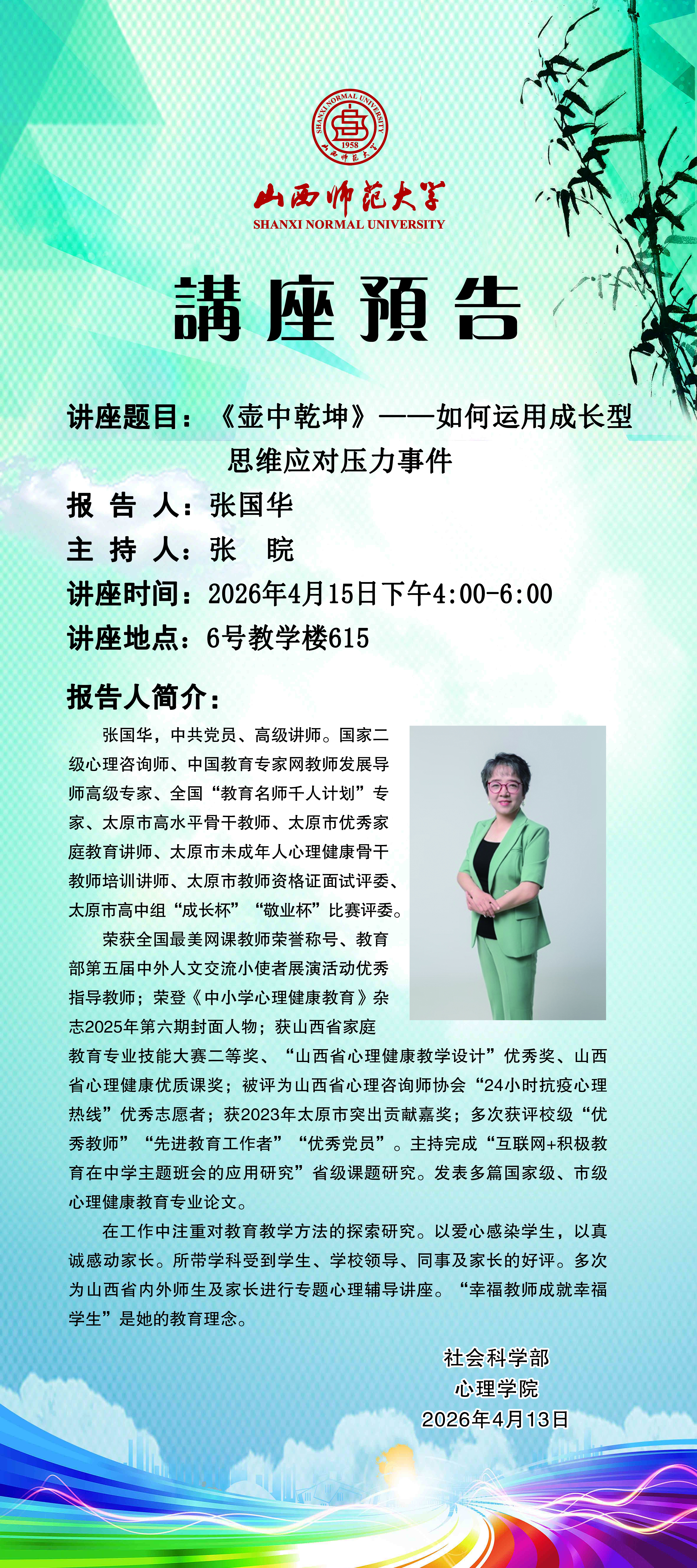 【讲座预告】《壶中乾坤》——如何运用成长型思维应对压力事件