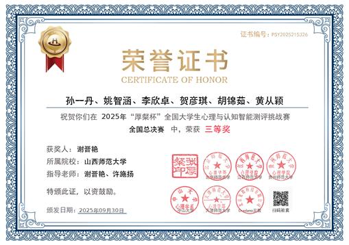 此次“厚粲杯”全国大学生心理与认知智能测评挑战赛多项荣誉的取得,是我院“以赛促教、以赛促学、以赛促创”育人理念的生动实践。未来,我院将继续深化教学改革,培养更多优秀人才,助力师生在全国舞台上持续绽放“山师风采”,续写学院发展的奋进篇章!
