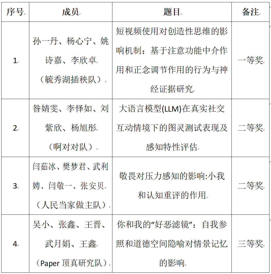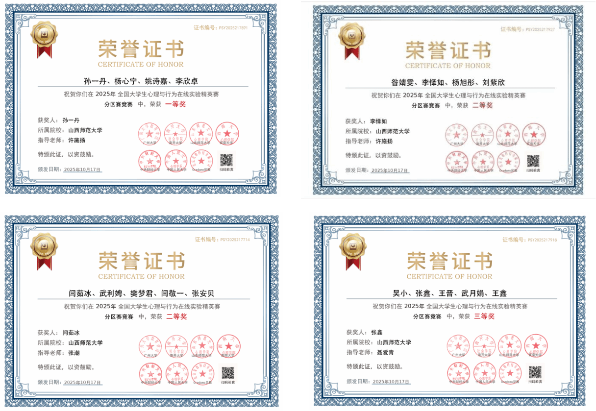在近期结束的全国大学生心理与行为实验精英赛北部赛区赛事中,由我校心理学专业研究生与本科生组成的四支代表队,历经校级初赛的严格选拔,在指导老师张潮教授、聂爱青教授、许施扬副教授的指导下,四支代表队在分区赛中凭借严谨的科学态度、创新的实验设计与出色的团队协作,最终全员载誉而归,斩获佳绩。