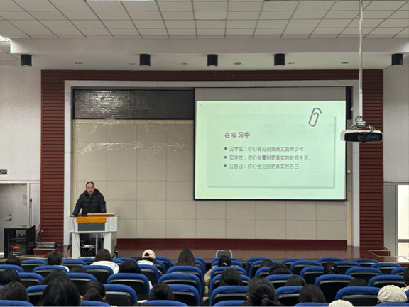 动员会由李慧燕老师主持。李慧燕老师首先强调了同学们在实习期间需融入的四大核心角色——教师、工作者、学习者与合作者,叮嘱同学们以“增长本领,成就自己”为宗旨,积极应对实习中的未知挑战。王美艳老师宣布实习规章制度与纪律要求。她明确实习生需严守学校实习纪律、保质完成实习任务,为实习工作的有序开展划定行为准则。张睆老师围绕“重新看待学生、学校与自己”三大维度,解析实习任务及其体验。他结合身份场景变化,说明需结合学校实际要求完成实习任务,鼓励同学们在实践中积极应对角色冲突。最后,两名22级优秀实习生结合自身实习经历,分享了课堂教学、学生管理等方面的实用经验,为即将踏上实习岗位的23级学弟学妹提供了鲜活参考。