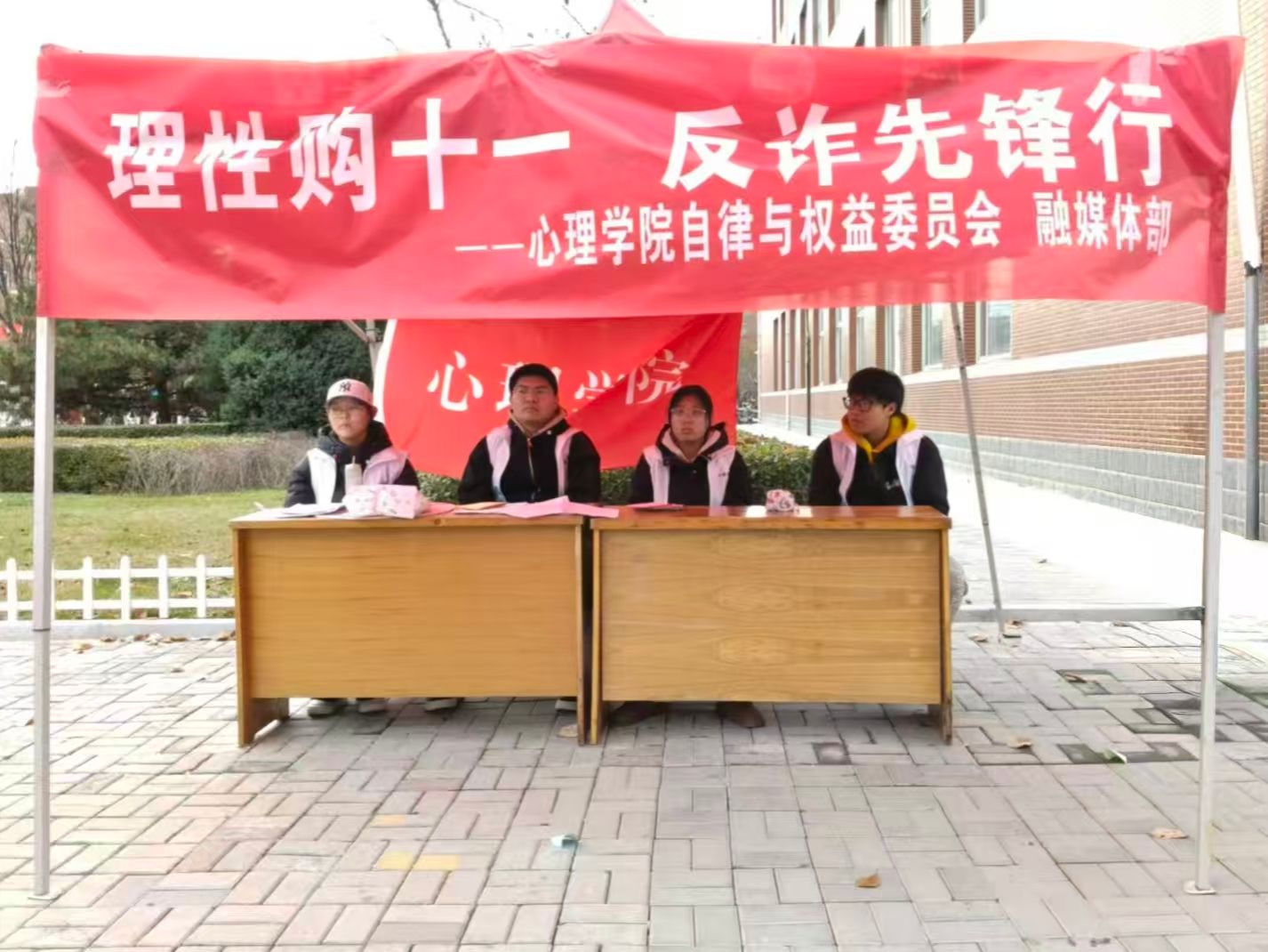 “双十一”消费浪潮来袭,如何在享受优惠的同时避开陷阱?为帮助同学们树立理性消费观念、提升反诈防骗能力,11月11日上午,我院自律与权益委员会与融媒体部在四、五号教学楼之间,组织开展了“理性点亮双十一,反诈护航消费季”特色教育活动。